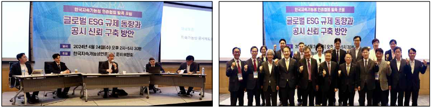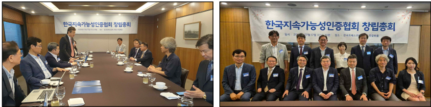 2023. 05. 13. 한국지속가능성인증포럼 설립추진단 결성 2024. 04. 24. 한국지속가능성인증포럼 준비 모임 및 발족 포럼 개최 2024. 07. 17. 한국지속가능성인증포럼 창립총회 발족 포럼 (FKI타워 2024.4.24) 창립총회 (한국프레스센터 2024.7.17)